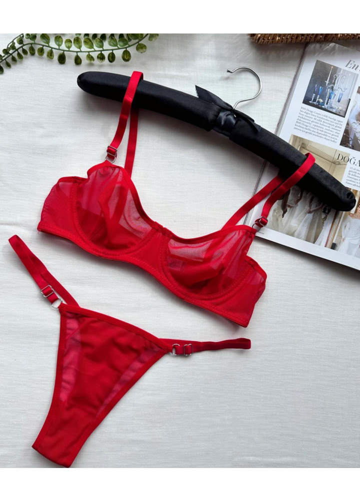 Kırmızı Tül Takım, şeffaf kırmızı tül dokusu ve minimal tasarımıyla feminen gücü ve cesareti ön plana çıkarır. Canlı kırmızı tonu, iddialı bir görünüm sunarken hafif ve nefes alabilen yapısı sayesinde gün boyu konfor sağlar.